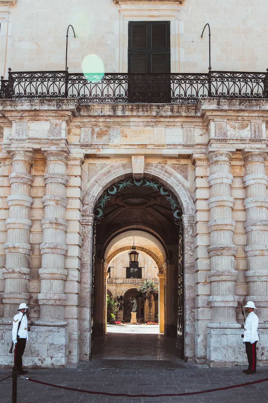 Lub jak mówi oryginalna nazwa Grandmaster’s Palace. Zwiedzanie rozpoczynamy od małego, aczkolwiek przytulnego dziedzińca. Stamtąd przechodzimy do budynku pałacu, który składa się z dwóch pięter. Z pałacu widać też duży dziedziniec, który zwany jest dziedzińcem Neptuna. Wędrując korytarzami pałacu przechodzimy do komnat, gdzie ściany ozdobione są w obrazy, freski oraz gobeliny. Po drodze mijamy też salę tronową, gdzie jak nazwa wskazuje znajduje się tron używany ówcześnie przez wielkich mistrzów i brytyjskich gubernatorów.