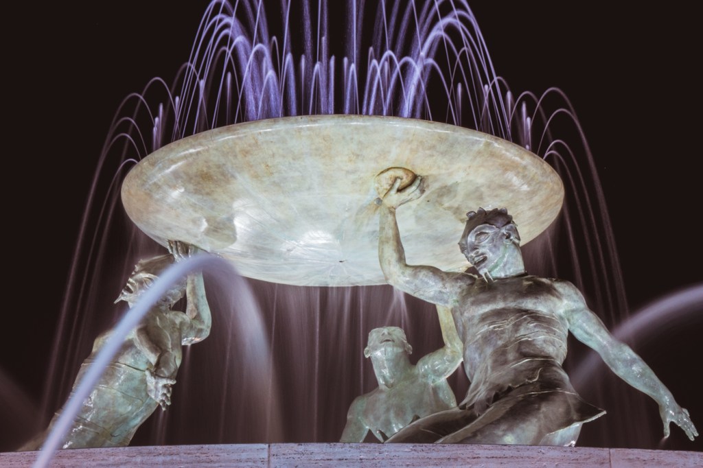 A bardziej poprawnie trzech Trytonów. Znak szczególny Valletty, na którym przysiedliśmy podczas wieczornego spaceru. Jeden z bardzo charakterystycznych symboli miasta, który już trochę w swoim życiu przeszedł, ale obecnie jest odrestaurowany i wita nas na wejściu do miasta.